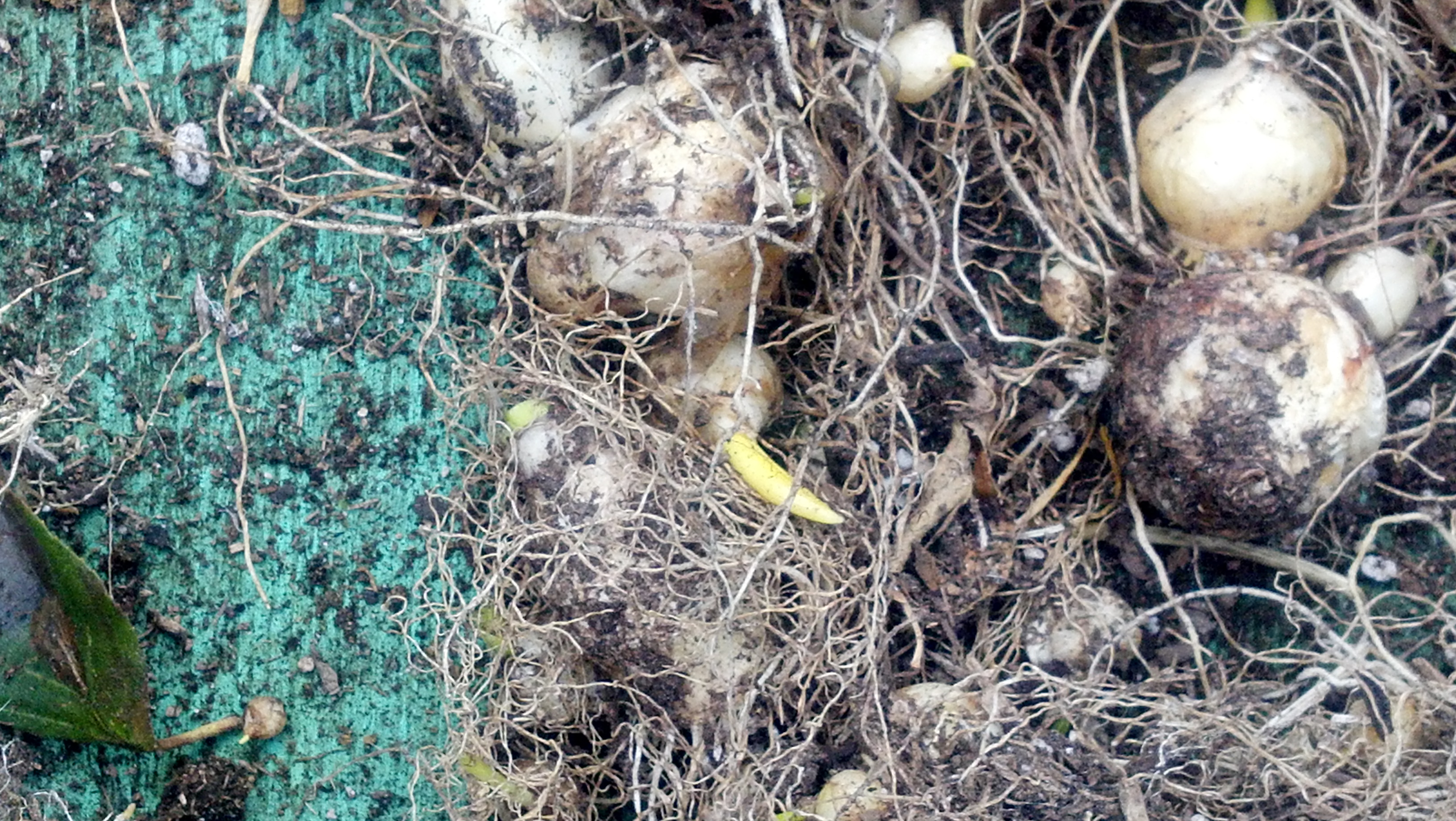 We’ve got two kinds of bulbs. One are the big, double-blooming tulips, the other are the bulbs from the little tiny blue tulips we planted last year. Last year was my first year planting bulbs, and I didn’t realize it, but bulbs sprout other tiny little bulbs in the course of their bulb lives. By the time I dug them up some time in May or June, we had about twice as many as we had originally planted, and a lot of them were teeny little green-onion looking things.
