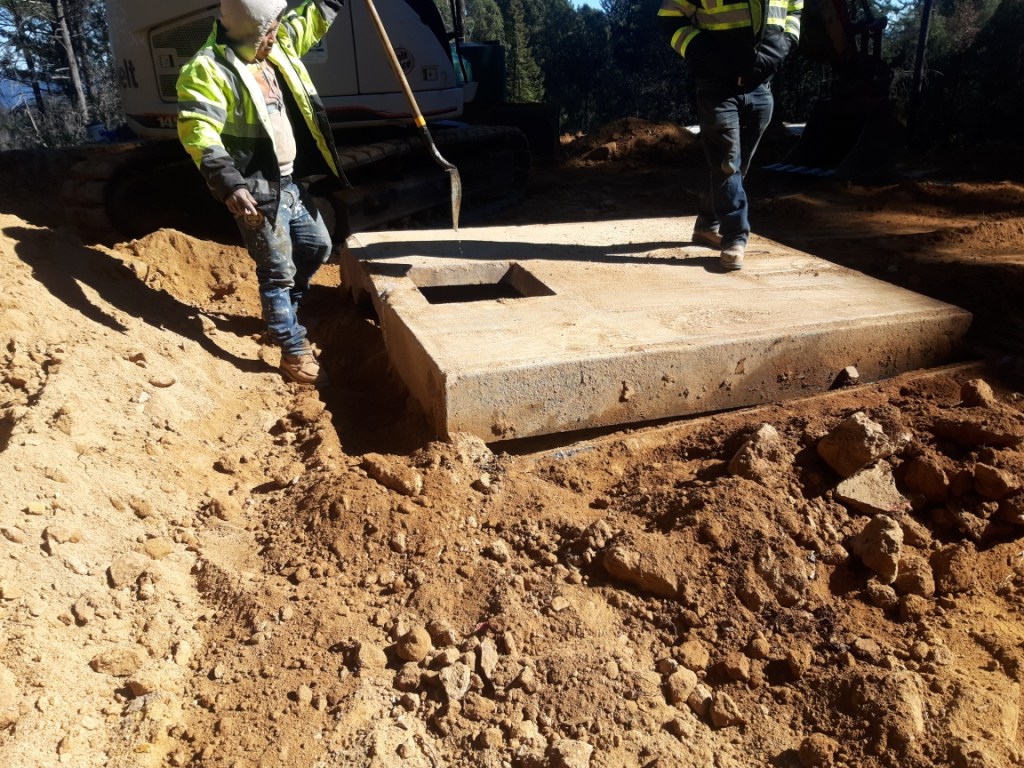 The meadow where Lise used to practice archery and where nothing has ever been built; the meadow where we’re building an ADU we can live in while the house gets rebuilt. The meadow where, since nothing was ever there, the county wanted us to get all kinds of extra inspections and surveys before they’d give us a permit. That meadow. Yeah, the builder and the architect thought that taking the top four feet off the hill would make the geologist happy (it did) and would give a bit more space for construction (it does) — well, it turns out that at three feet down, there was a septic tank.